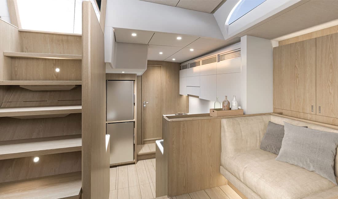 À l’intérieur, le Solaris 74 propose une atmosphère élégante et chaleureuse, où chaque espace est pensé pour le confort en mer comme à quai. Les volumes généreux, la luminosité naturelle et la qualité des matériaux créent un cadre de vie raffiné et apaisant.