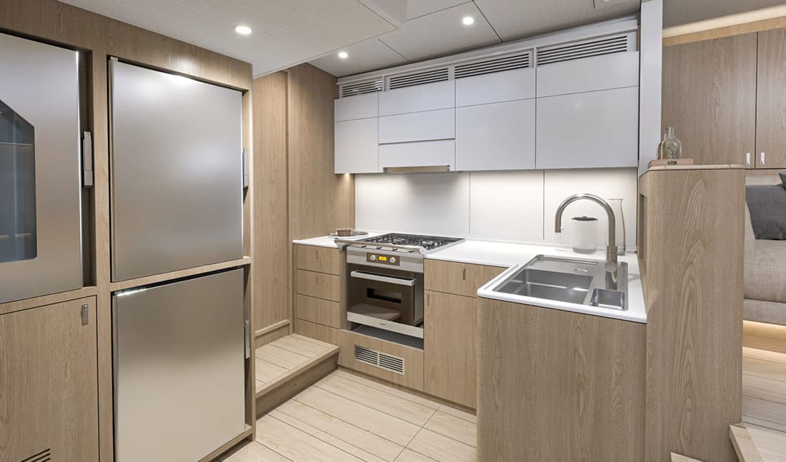 Les aménagements sont entièrement personnalisables, permettant de configurer cabines, salles de bain et espaces de vie selon votre programme de navigation et vos envies.